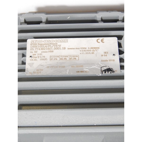 Moteur asynchrone triphasé ventilé de marque SEW, couplage étoile et triangle possible. Puissance 3KW, 1500tr/min, alimentation triphasé 230/400V.