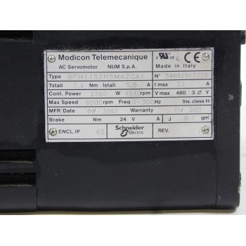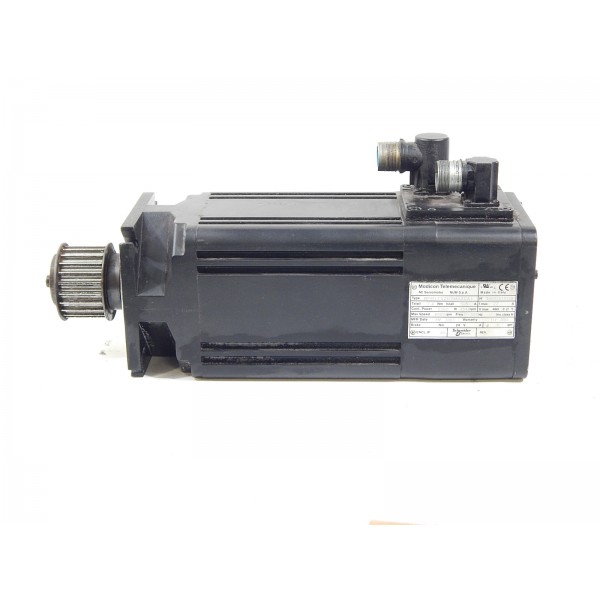 Servomoteur MODICON TELEMECANIQUE NUM, 7,4NM, 5,5A, 4540tr/min équipé d'un frein 24Vdc et d'un resolver une paire de poles. Il est piloté par un variateur de la gamme LEXIUM SCHNEIDER
