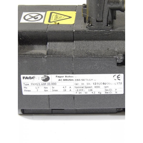 Moteur Fagor d'axe brushless 6000 tr/mn 7NM FKM21.60F.I0.000 piloté par les variateurs AXD FAGOR.